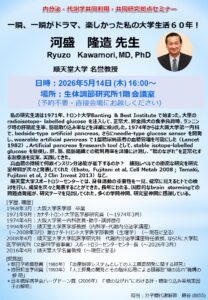 ” 一瞬、一瞬がドラマ、楽しかった私の大学生活60年!” Ryuzo Kawamori, M.D., Ph.D.Juntendo University Thursday, May 14 th, 2026 16:00~IMCR Gunma Univ. 1F Conference Room Click here