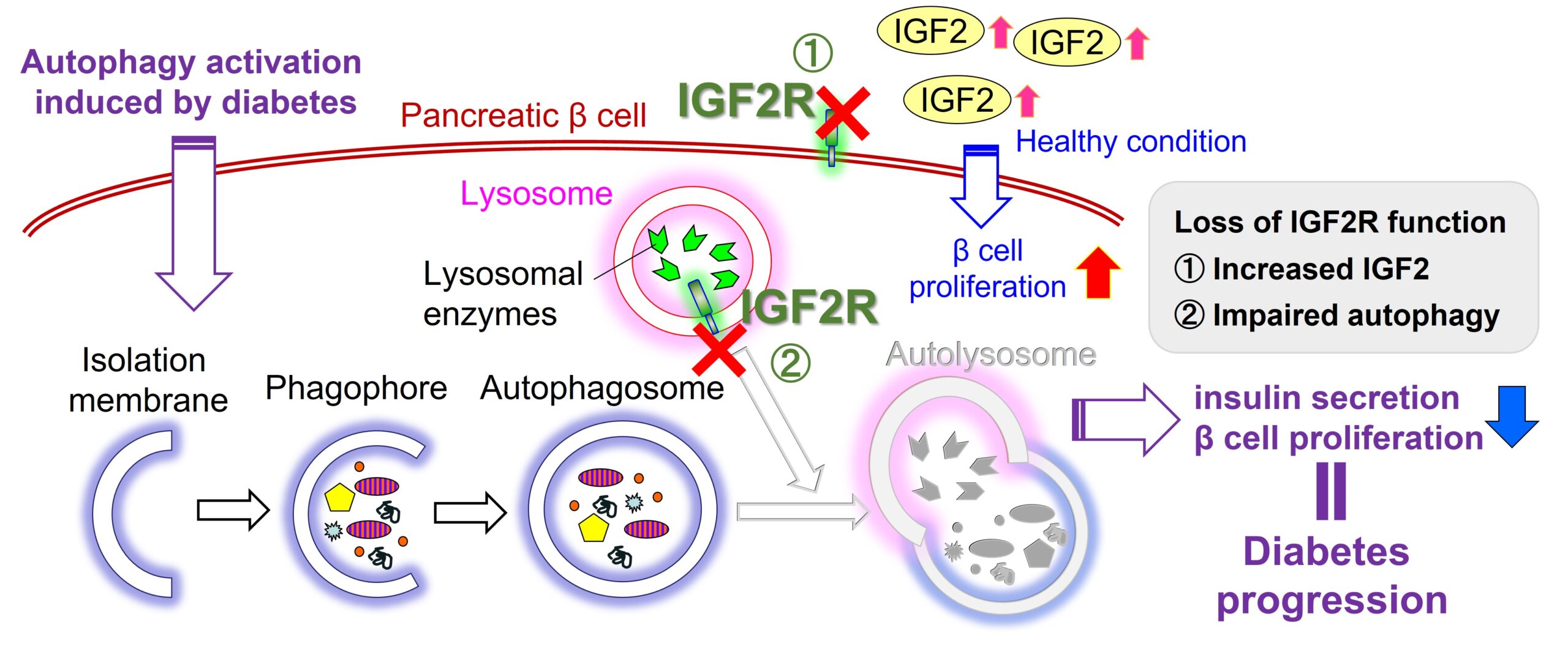 Insulin-like growth factor -2 receptor (IGF2R), also known as cation-independent mannose-6-phosphate receptor (CI-MPR), is localized in cytosolic vesicles and is unique in its ability to transport enzymes to the lysosome and to clear IGF2 from the cell surface by acting as a scavenger receptor. To evaluate the direct role of IGF2R in β-cell biology we undertook complementary in vitro knockdown and in vivo knockout approaches. A β-cell line with a stable knockdown of IGF2R (IGF2RKD), exhibited decreased glucose-induced insulin secretion, and enhanced cell proliferation. Tamoxifen-inducible β-cell-specific IGF2R knockout mice exhibited impaired glucose tolerance and blunted insulin secretion after high-fat diet-loading that was likely secondary to reduced β-cell mass due to attenuated proliferation. β-cells with IGF2RKD exhibited decreased autophagosomes following starvation, which was accompanied by a reduced expression of p62, LC3B, and ULK1. Aged mice also showed impaired autophagy in βIGF2R-deficient β-cells. Reduced IGF2R function and m6A methylation were observed in islets from both mouse and human type 2 diabetes. Taken together, these data point to IGF2R as an important regulator of insulin secretion, cell proliferation and autophagy in mammalian β-cells.