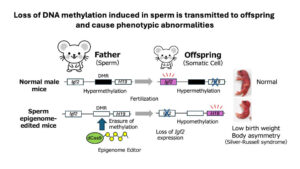 In this study, we developed a “sperm-specific epigenome editing system” that erases DNA methylation and examined it in mice. The target region, H19-DMR, is known to exhibit epigenomic abnormalities in patients with Silver-Russell syndrome and is normally hypermethylated in sperm. Using this system, we successfully reduced methylation levels in this region. As a result, part of the reduced methylation state in sperm was inherited by offspring, which exhibited characteristics such as low birth weight and body asymmetry, similar to Silver-Russell syndrome. However, not all abnormalities were inherited; some were restored after fertilization by a safety mechanism involving histone modification H3K9me3.