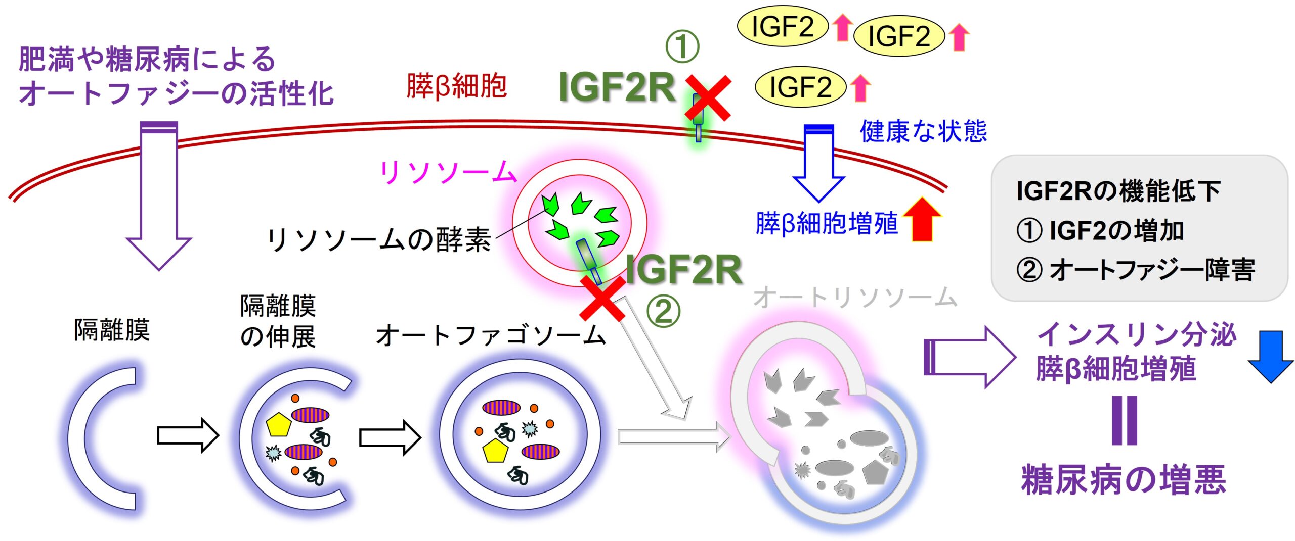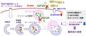 本研究により、IGF2Rは短期的には細胞増殖を抑える一方、長期的にはオートファジー維持を介して膵β細胞を守る二面的な役割を持ち、糖尿病進展に深く関与する分子であることが分かりました。今後、IGF2Rを標的とした新たな糖尿病治療法の開発が期待されます。