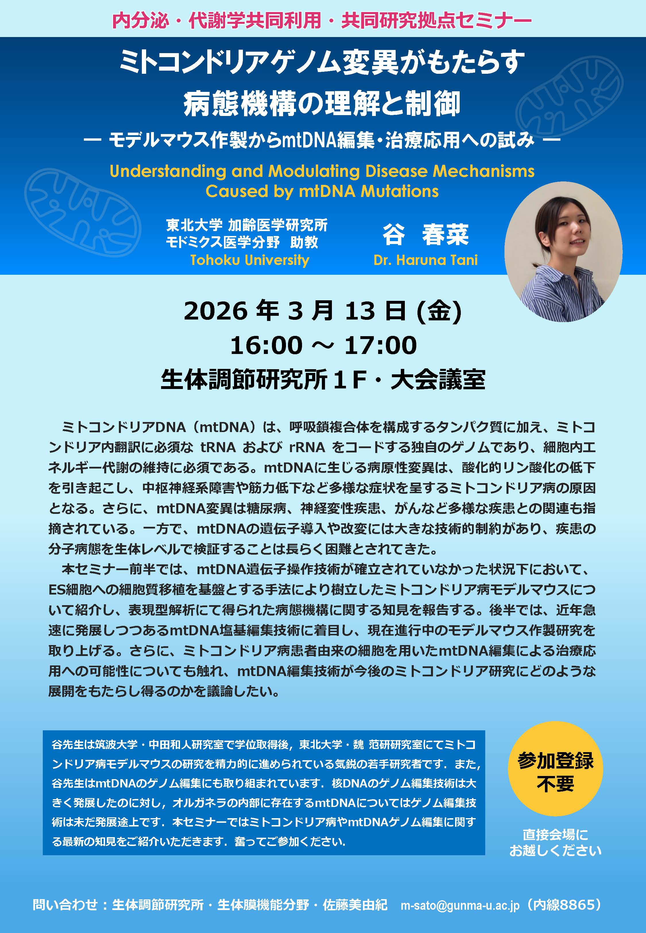 「ミトコンドリアゲノム変異がもたらす病態機構の理解と制御-モデルマウス作製からmtDNA編集・治療応用への試み-」 ・講師:谷…